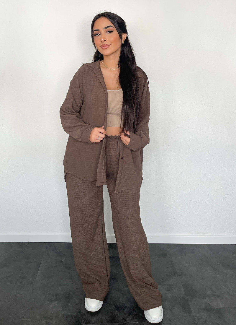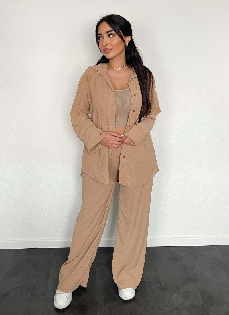 Yona marškiniai ir kelnių rinkinys yra ideali pasiūlymas moterims, kurios nori sujungti elegantišką išvaizdą su kasdieniu komfortu. Klasikinio kirpimo marškiniai puikiai dera su paprastomis kelnėmis, sukurdami nuoseklų, madingą stilių, kurį galite dėvėti tiek darbe, tiek socialiniuose susitikimuose. Aukštos kokybės medžiagos užtikrina komfortą visą dieną, o subtilūs detalės suteikia rinkiniui elegancijos. Yona yra rinkinys, kuris sujungia paprastumą, eleganciją ir funkcionalumą, puikiai pritaikydamas skirtingoms progoms.